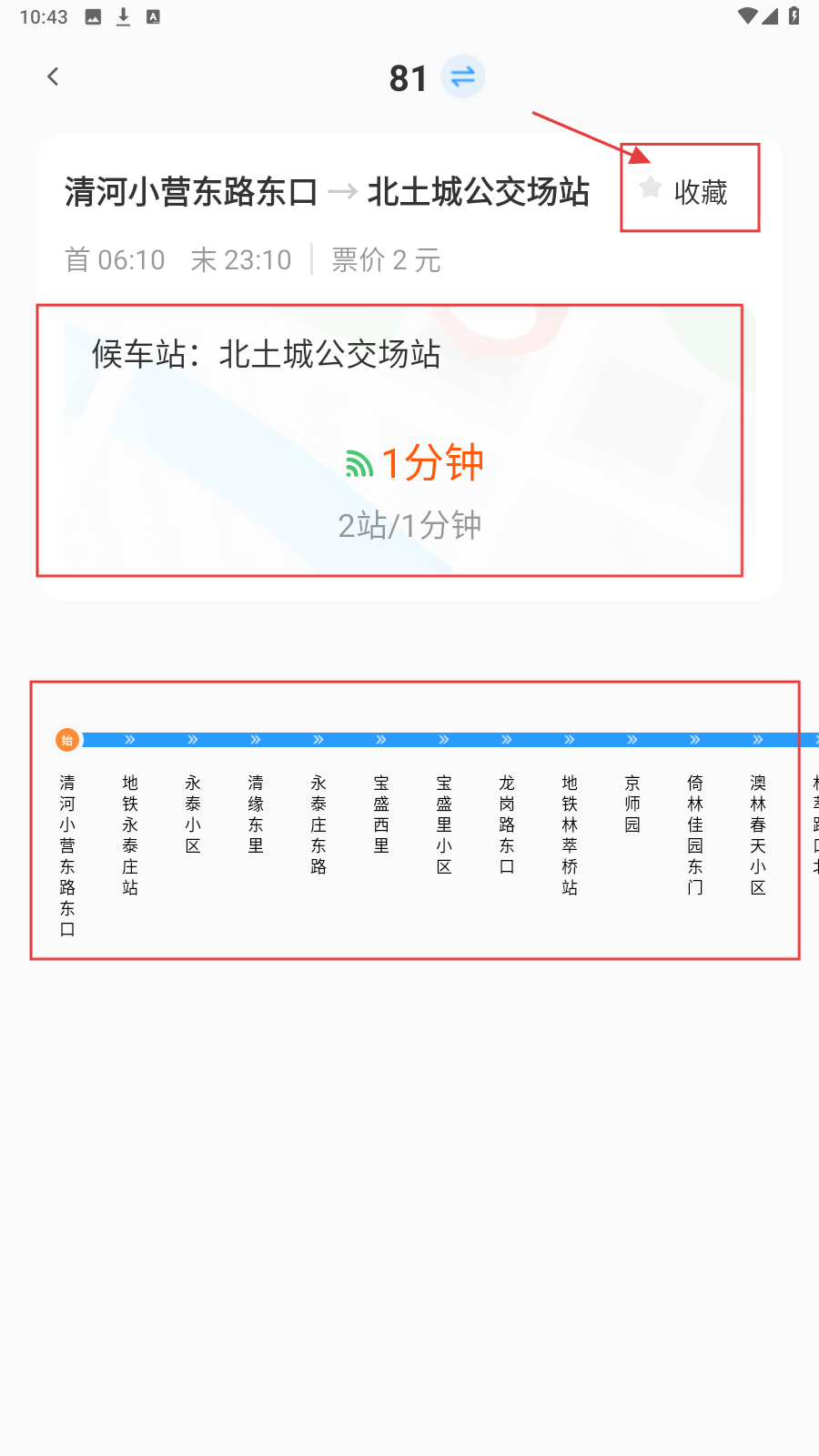3、输入后,点击进入所查询的公交详情页,查看公交详细信息,如若需要可以点击【收藏】。