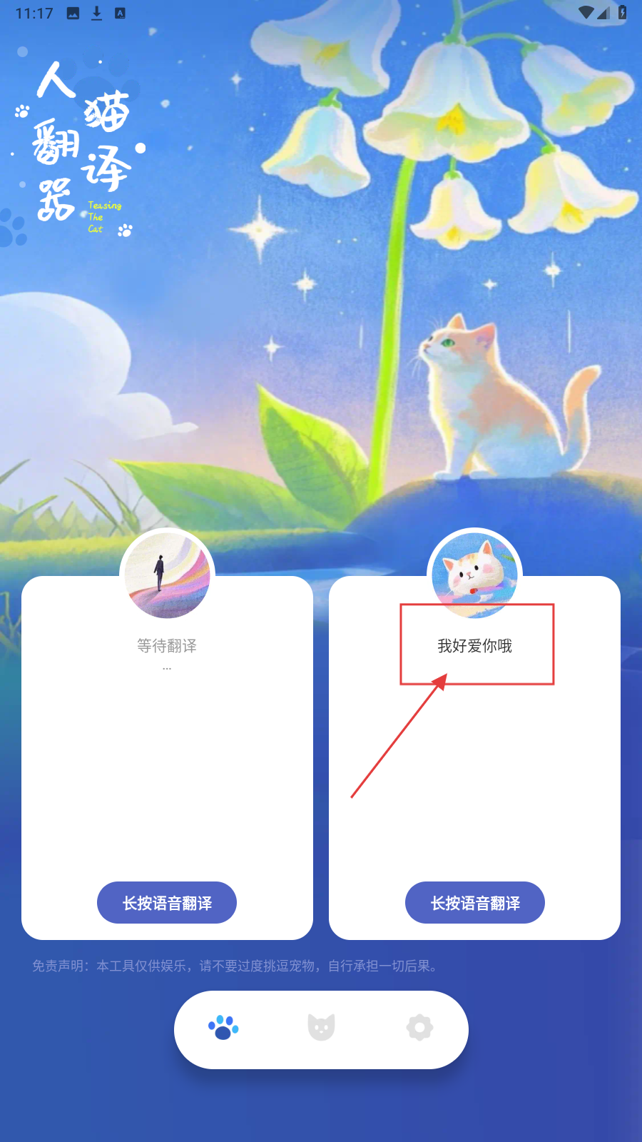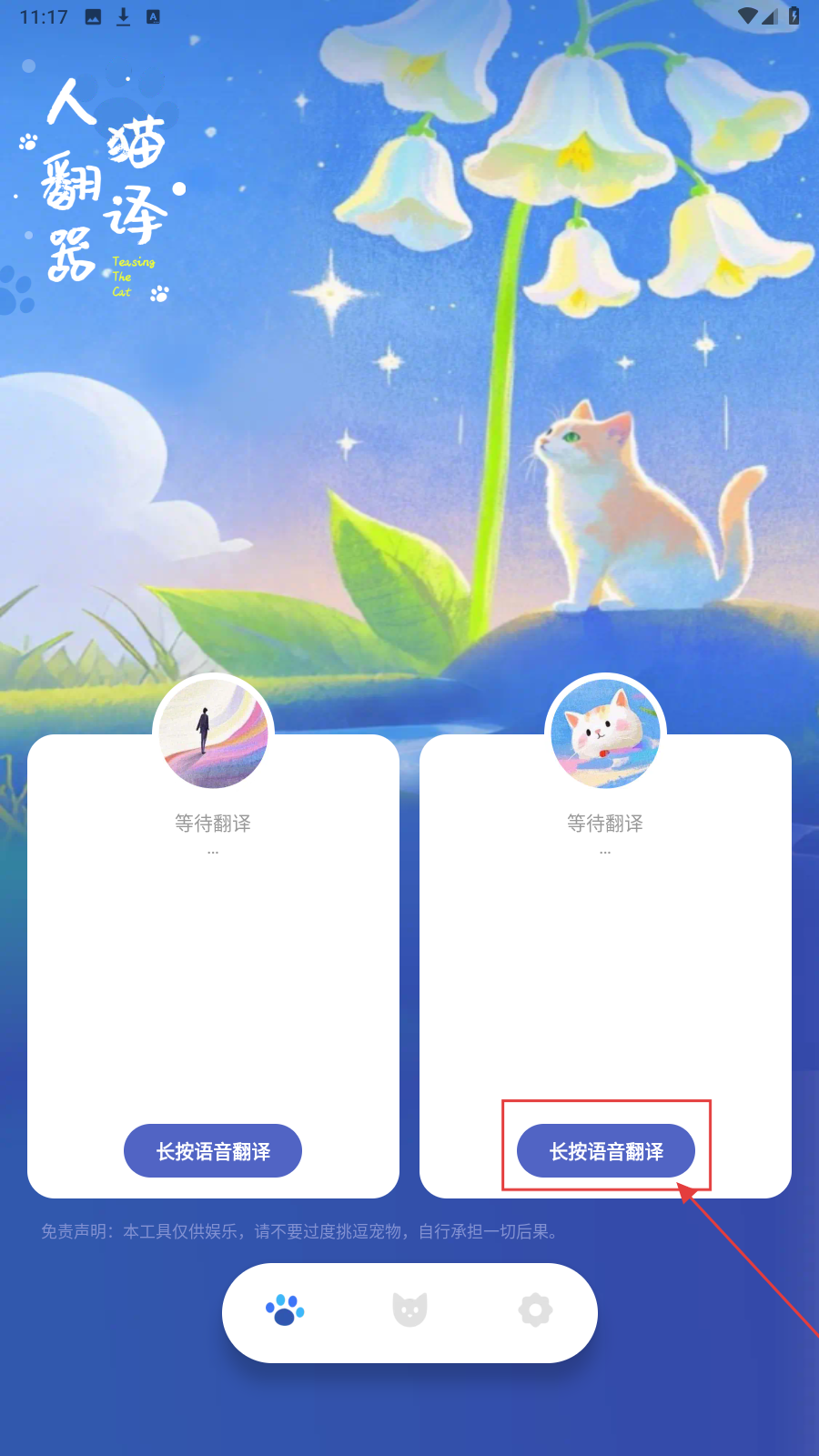 1、打开【撸撸猫咪社区】,长按右侧【长按语音翻译】,录入猫说的话。
