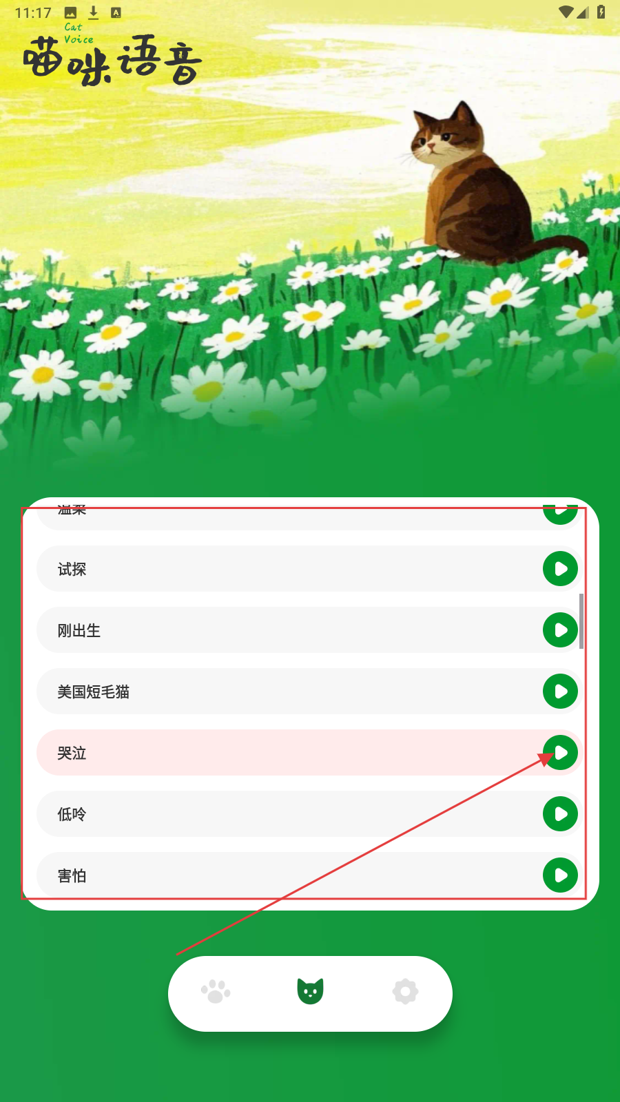 3、切换到【猫咪语音】页,选语音类型(如哭泣),点右侧播放键,逗猫互动。