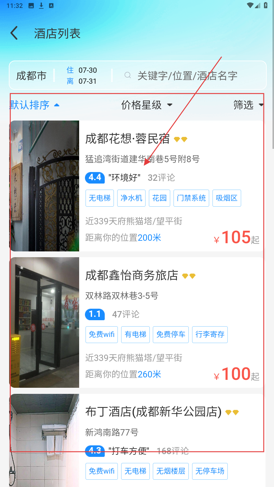 2、在酒店列表,选目标酒店(如花想蓉民宿),查看房型与价格。