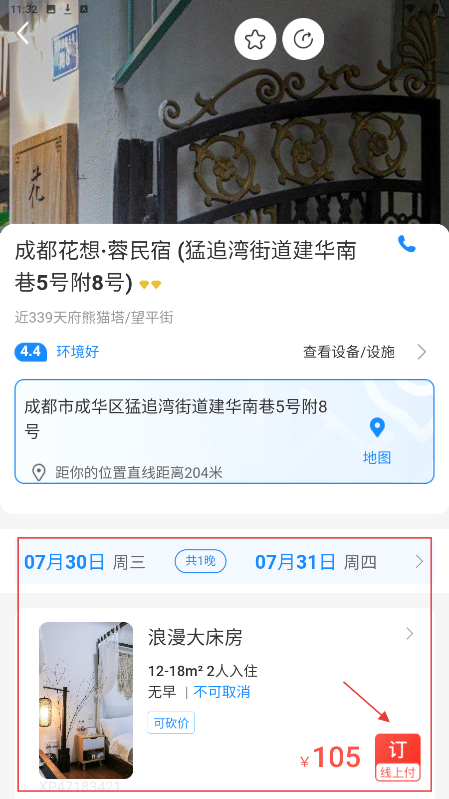 3、进入民宿详情,选【浪漫大床房】,确认信息后点【订】。
