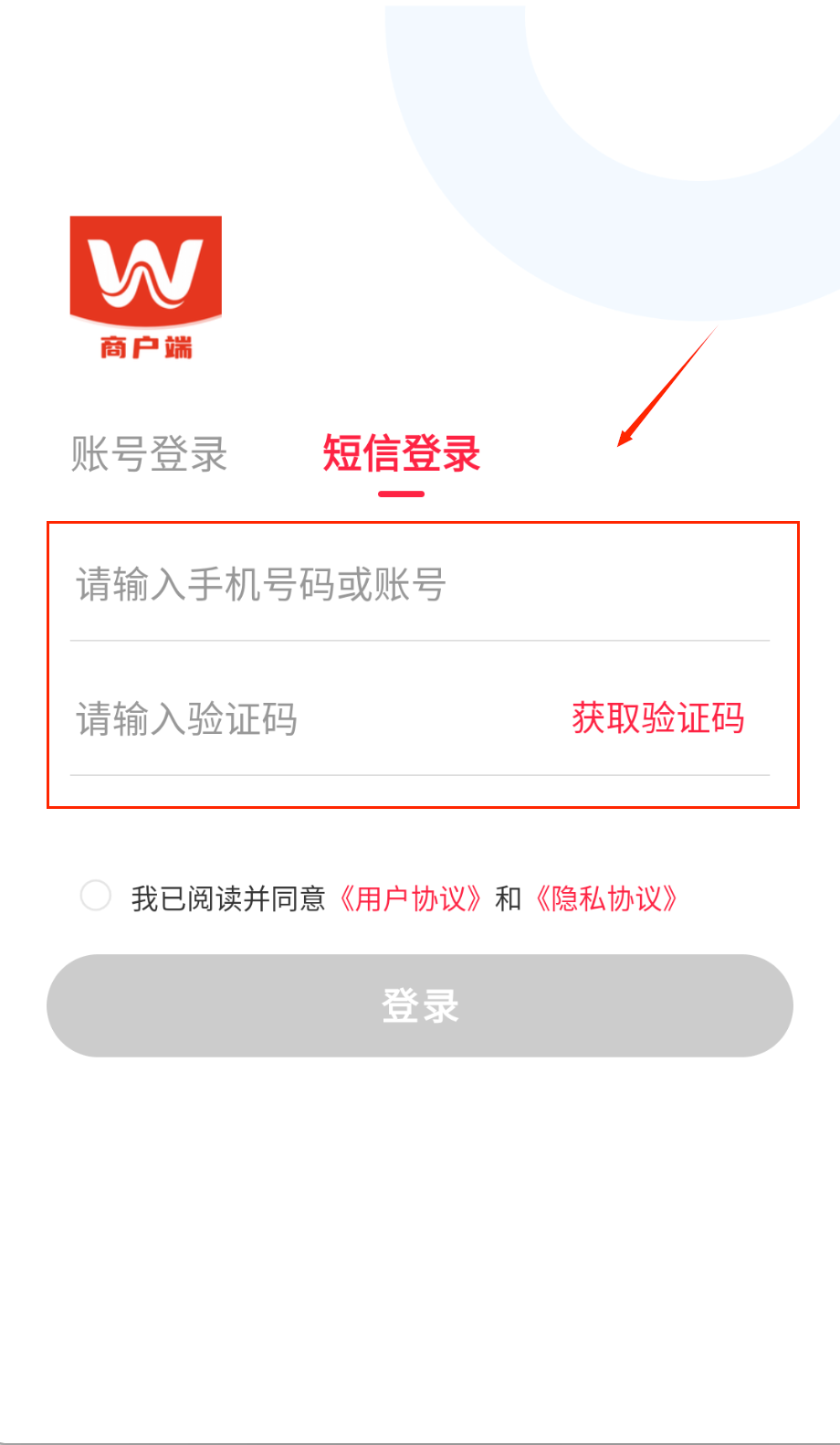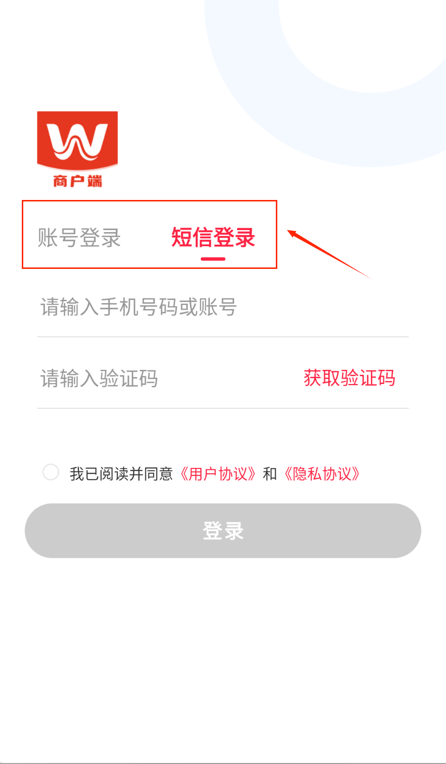 1、打开APP进入登录页,顶部显示"商户端"标识,选择账号或短信登录方式呀。账号登录需输入注册手机号和密码哦。