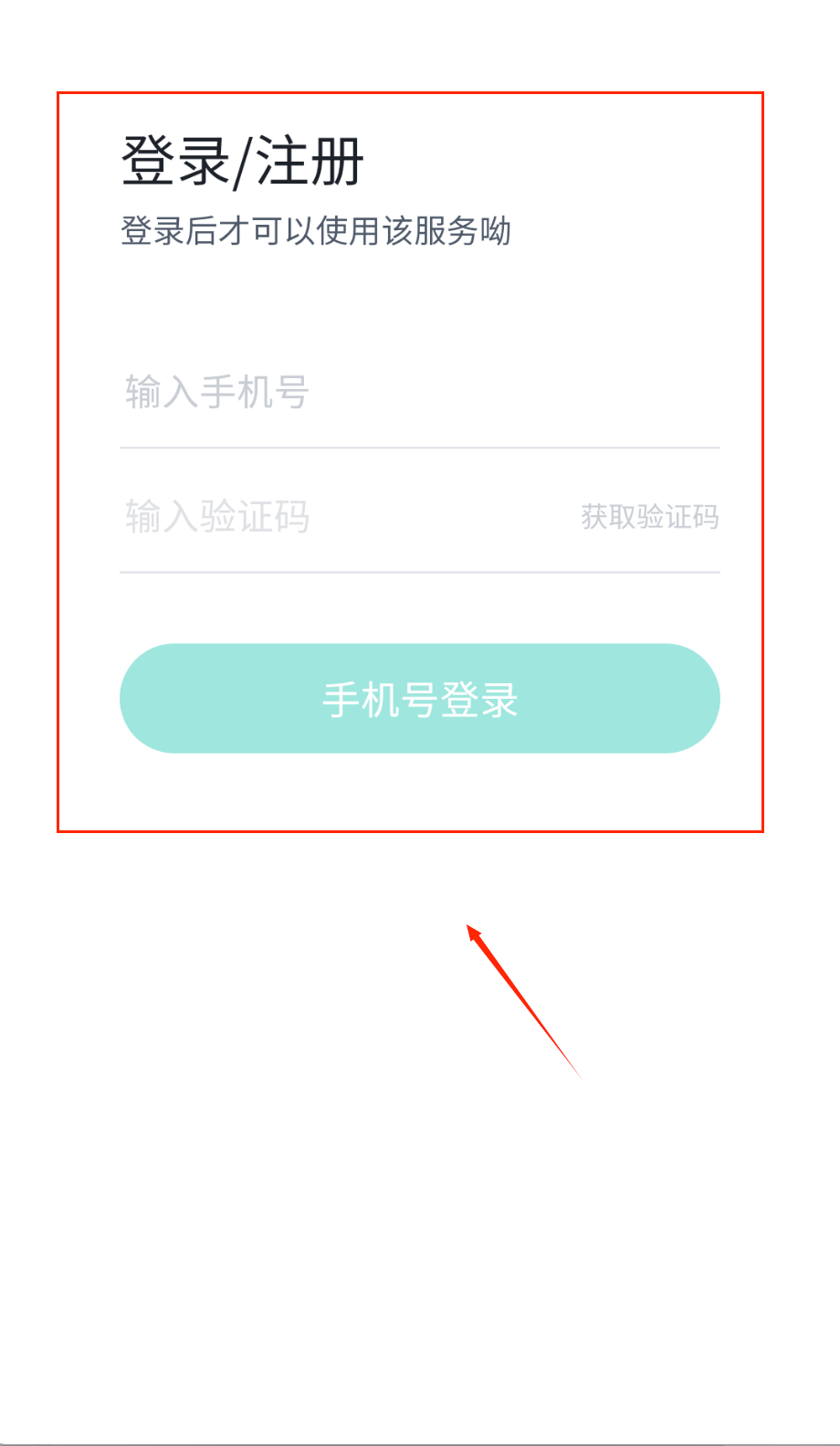 1、打开APP后看到白色登录页面,顶部显示时间,中间有"登录/注册"大标题,下方提示需登录才能使用服务哦。