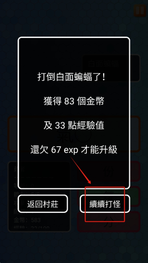 4、继续冒险:在战斗结束后,点击“繼續打怪”按钮,继续游戏的冒险旅程。
