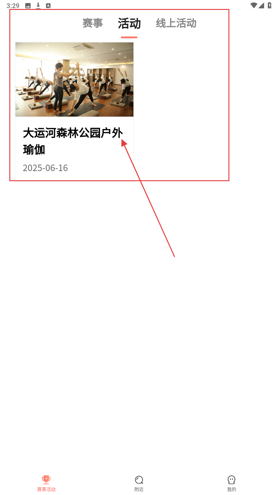 1、在活动列表,选感兴趣活动(如户外瑜伽),点击进入详情页,了解活动内容。
