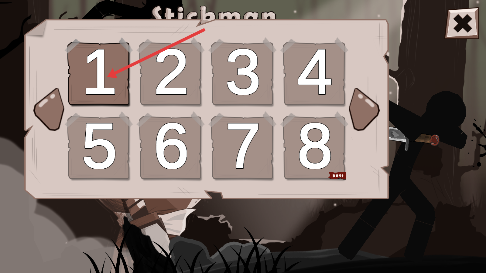 1、在【Stickman】游戏里,选择标有【1】的关卡按钮,点击进入对应关卡,开启首场战斗挑战。