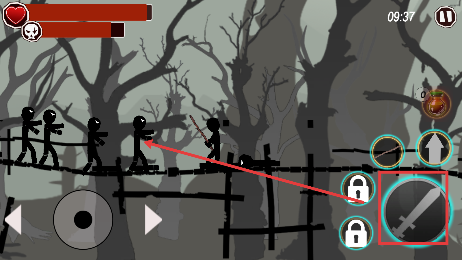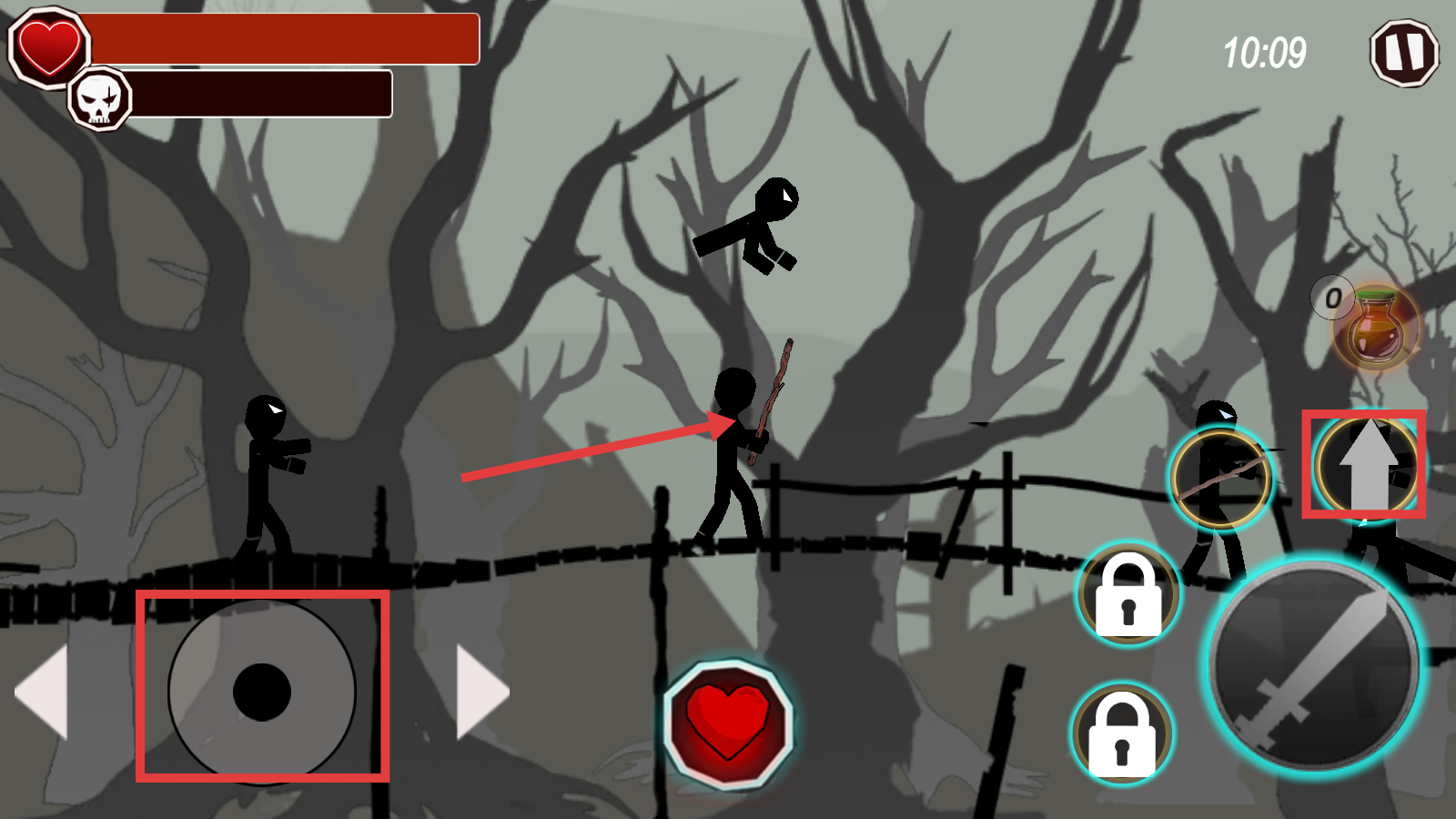 2、操作左侧摇杆移动角色,点击右侧攻击按钮,用木棍攻击敌人,也可按跳跃键躲避敌方攻击。