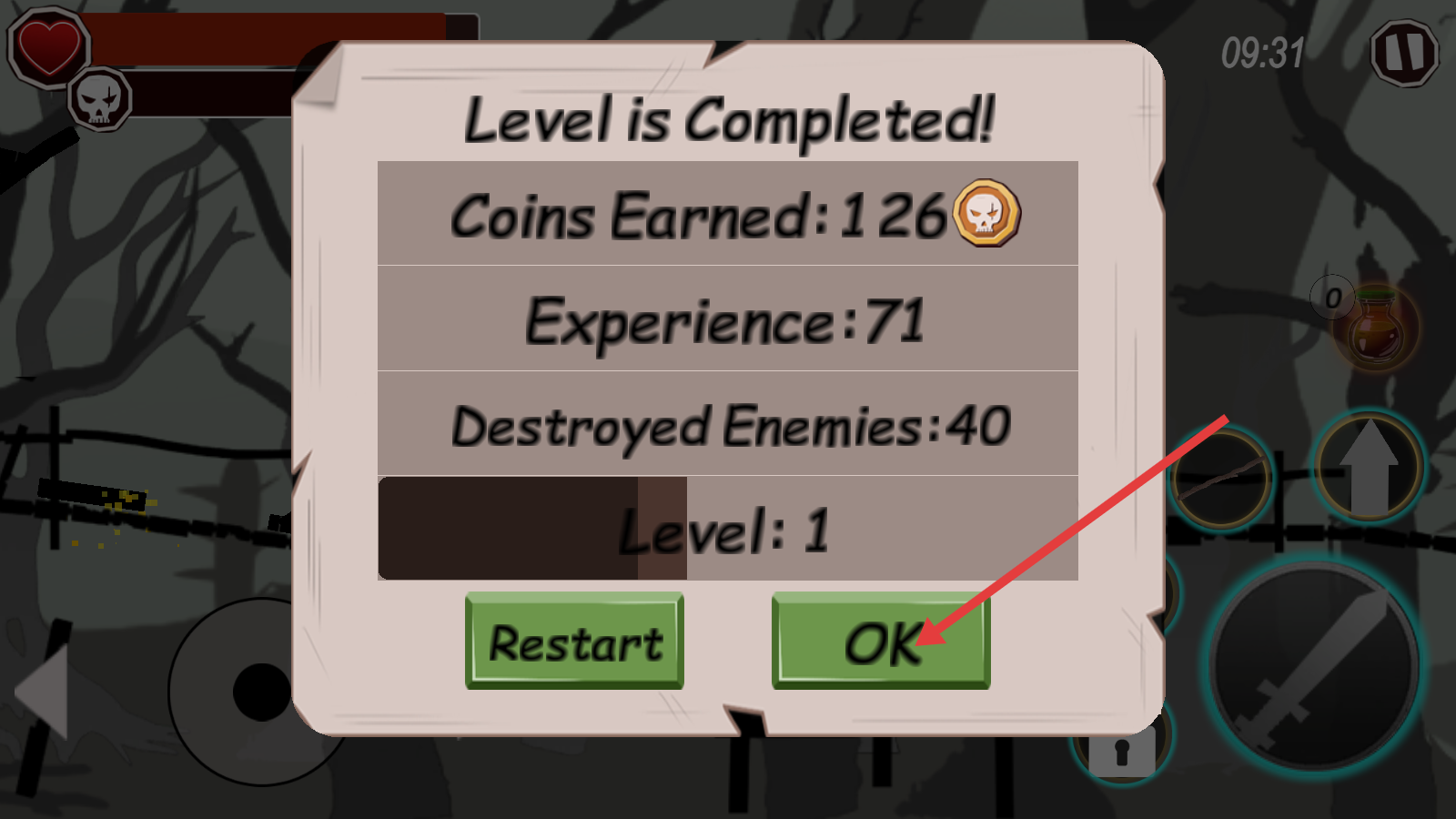 4、关卡完成后,点击绿色【OK】按钮,确认并领取【126】金币与【71】经验,为下一关做准备。