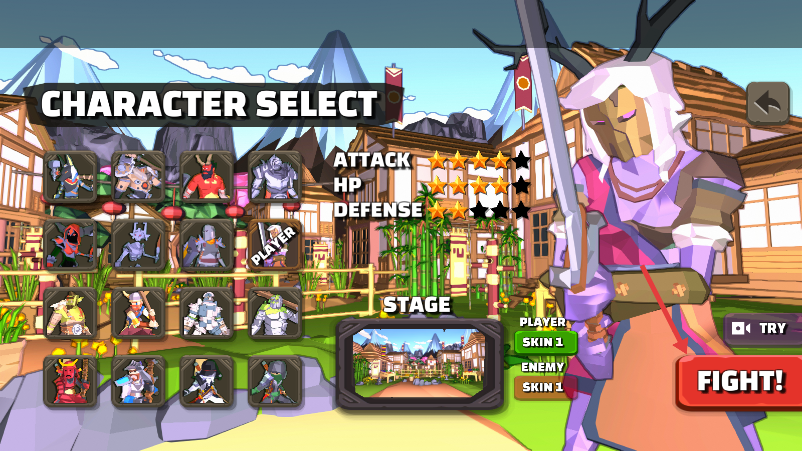 1、在【CHARACTER-SELECT】界面选角色,查看【ATTACK】【HP】【DEFENSE】属性,点击红色【FIGHT!】按钮进入战斗。