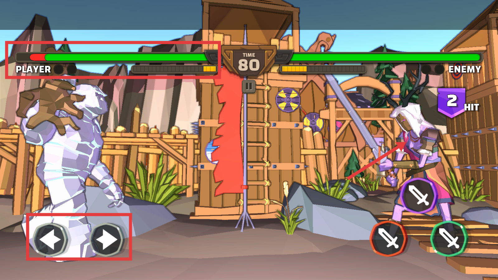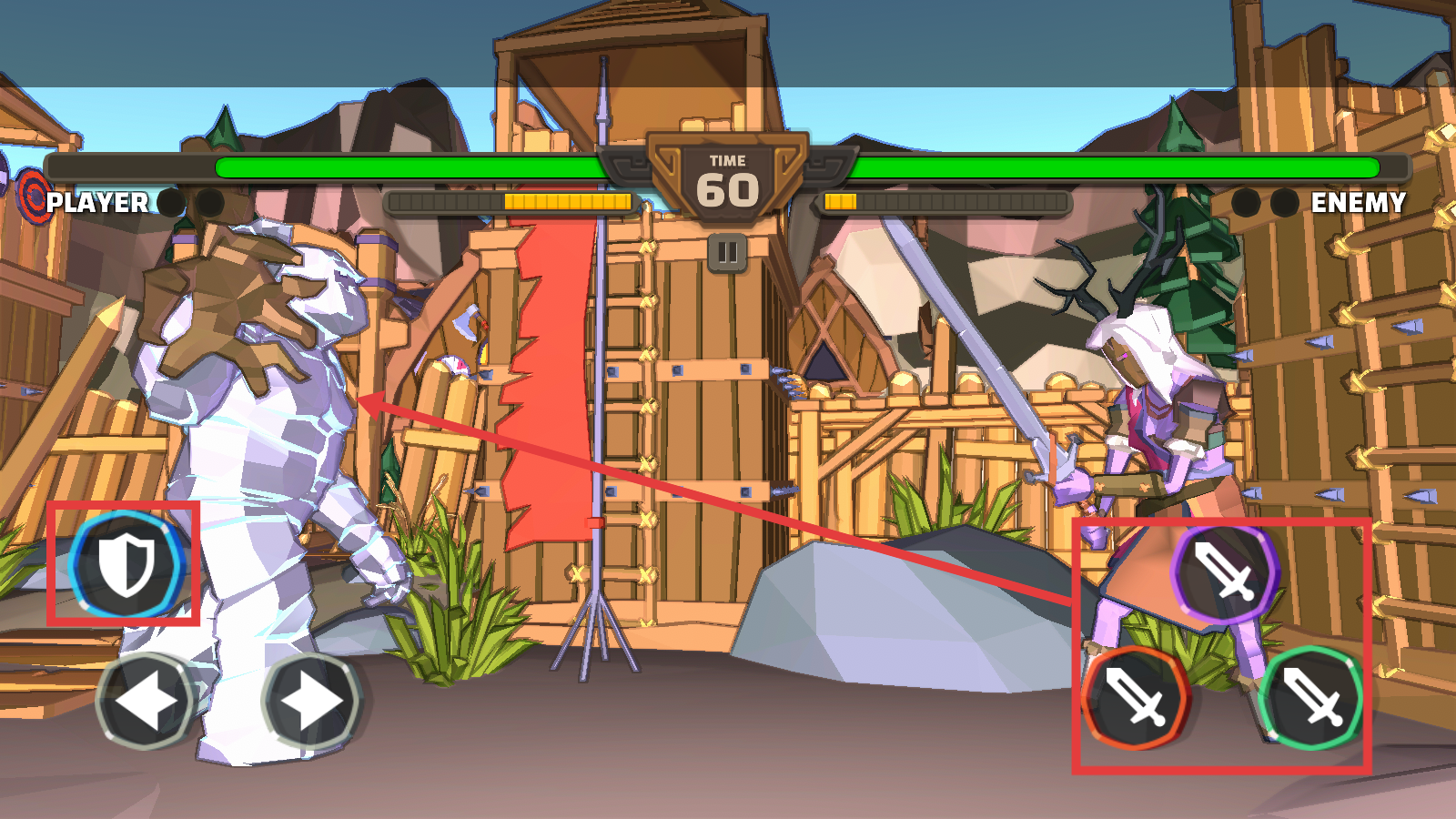 3、敌人进攻时点击左侧盾形按钮防御,随后按右侧不同攻击键释放连招,快速压制敌人血条。