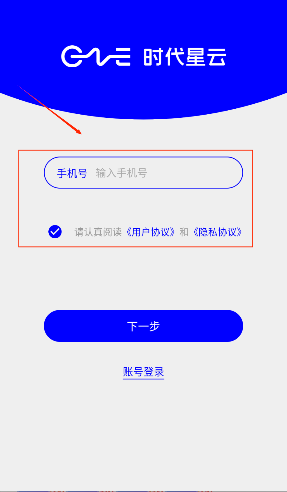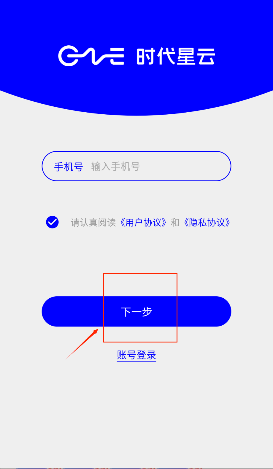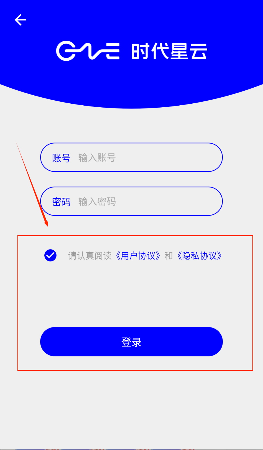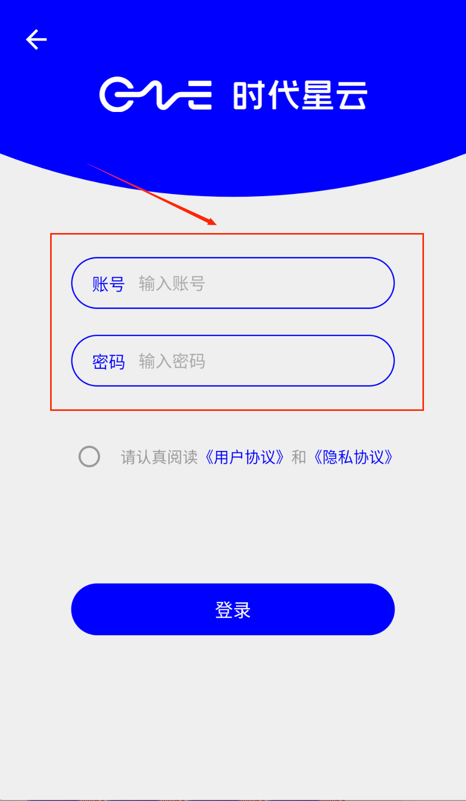1、打开APP后首先看到蓝色登录界面,顶部有"时代星云"标志,中间是账号密码输入区域哦。