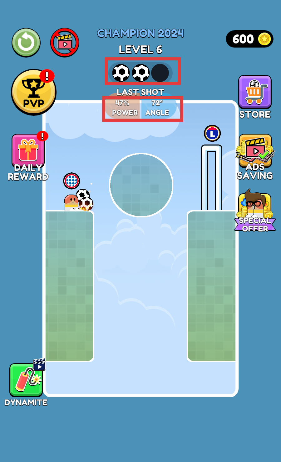 2、LEVEL-6关卡按提示【Drag-to-aim】【Release-to-Shoot!】,拖动足球瞄准右侧目标,精准把控射击时机推进关卡。
