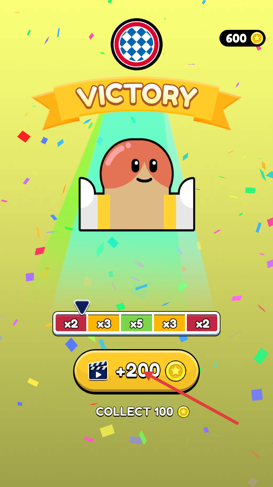 4、胜利后出现【VICTORY】界面,可点【+200】看广告加倍奖励,或直接选【COLLECT-100】领取基础金币。