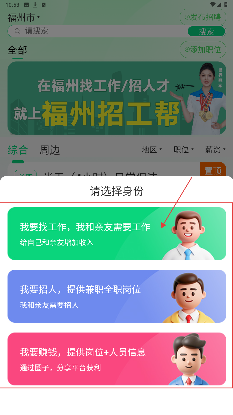 1、打开应用,选择身份,如点击【我要找工作】身份。