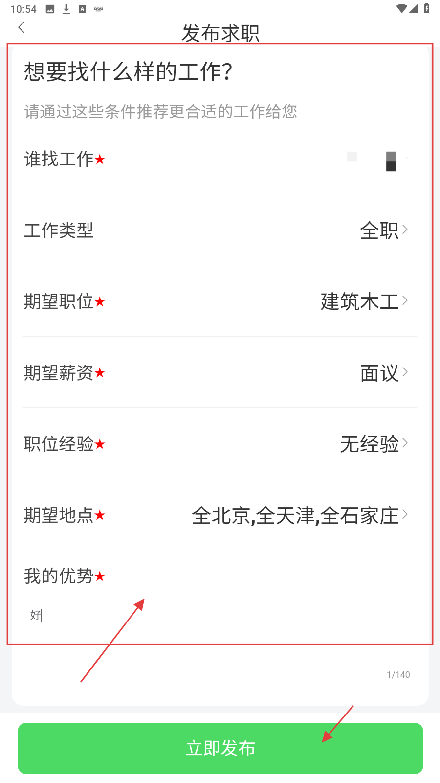 2、在【发布求职】页面,按照自身信息填写,填写完成后点击【立即发布】。