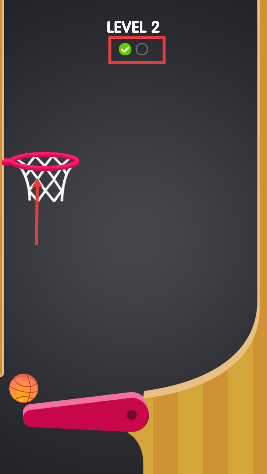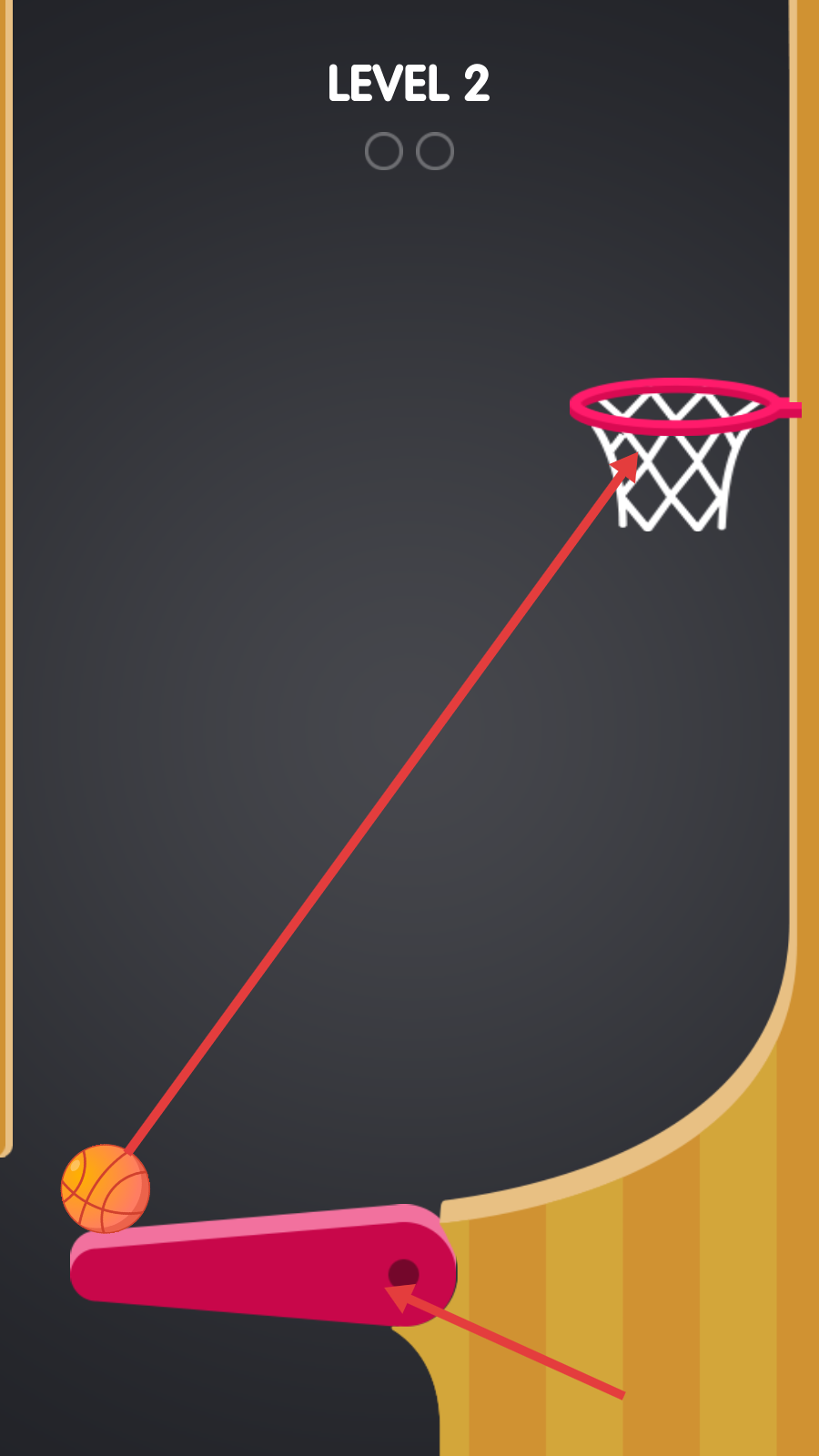 2、Level-2中观察篮球与篮筐位置,调整粉色弹板角度,让篮球沿轨迹精准射入篮筐以推进关卡。