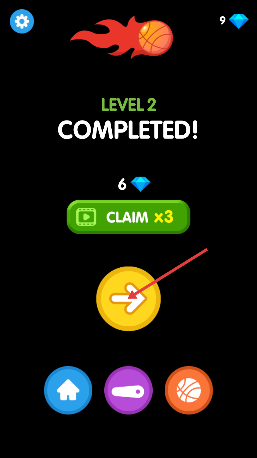 4、关卡完成界面显示【LEVEL-2-COMPLETED!】,点击黄色箭头按钮,领取6钻石奖励并推进至下一关。
