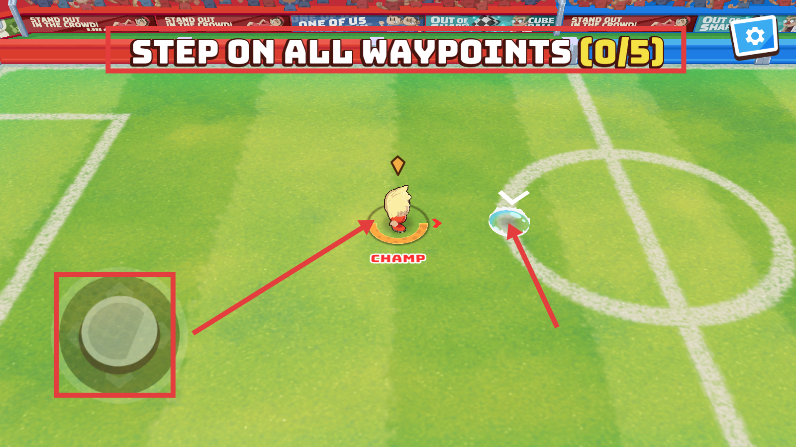 2、关卡中按【STEP-ON-ALL-WAYPOINTS-(0/5)】提示,滑动左侧摇杆操控角色,踩绿色标记点推进进度。