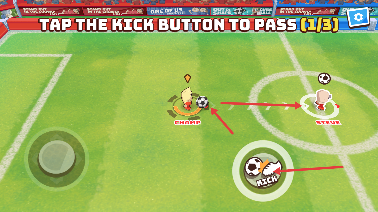 4、遇传球任务时,按【TAP-THE-KICK-BUTTON-TO-PASS-(1/3)】提示,点击踢球按钮完成传球推进关卡。