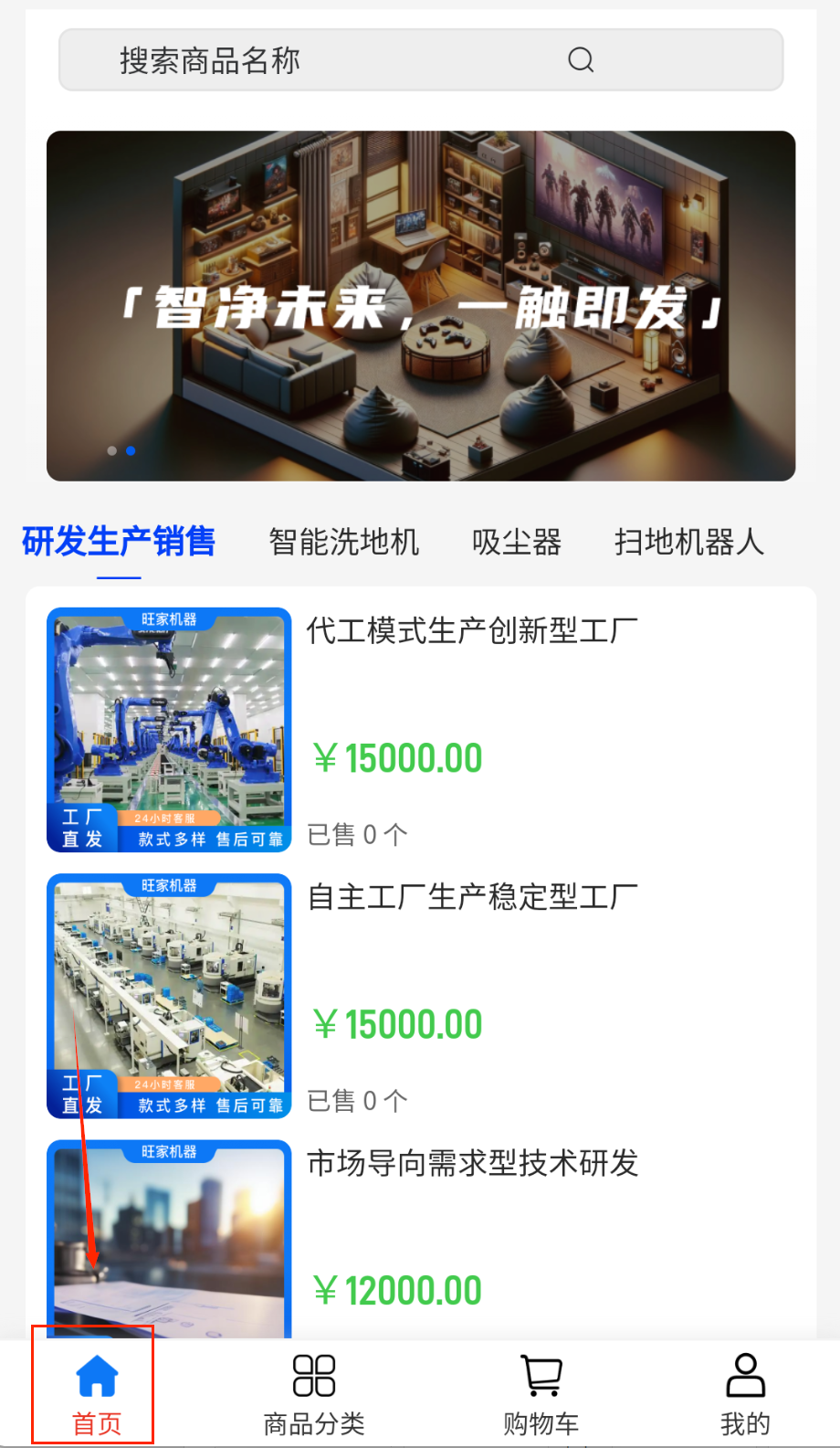 1、新用户注册需填写手机号和验证码,系统提供8大类智能清洁设备分类,包含扫地机器人、洗地机、吸尘器等。