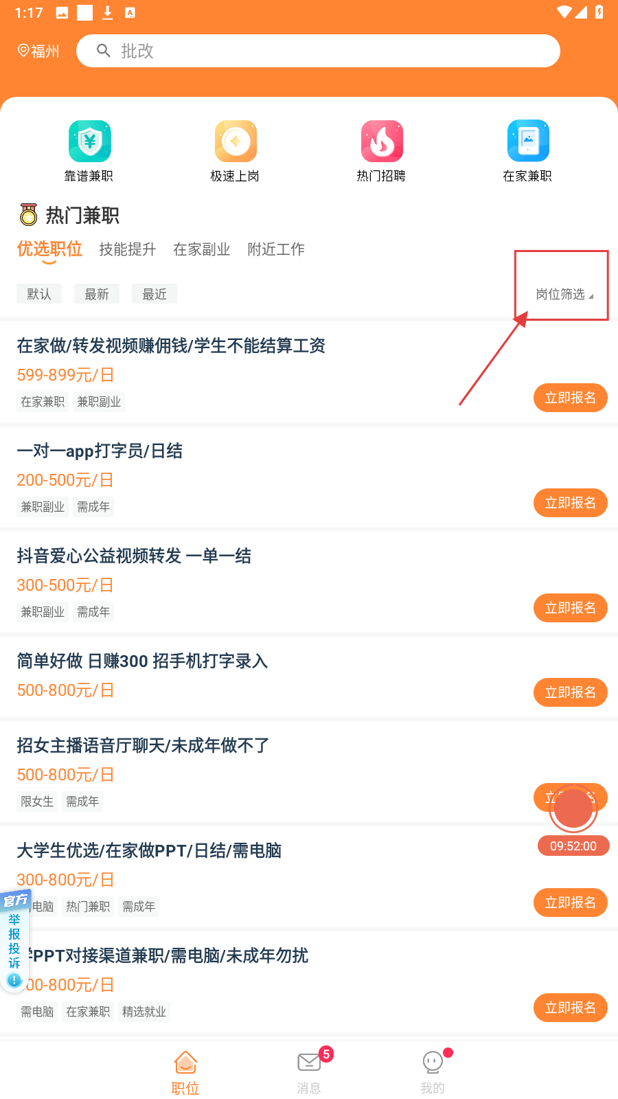 1、在【职位】页,点【岗位筛选】,缩小兼职搜索范围,精准找岗。