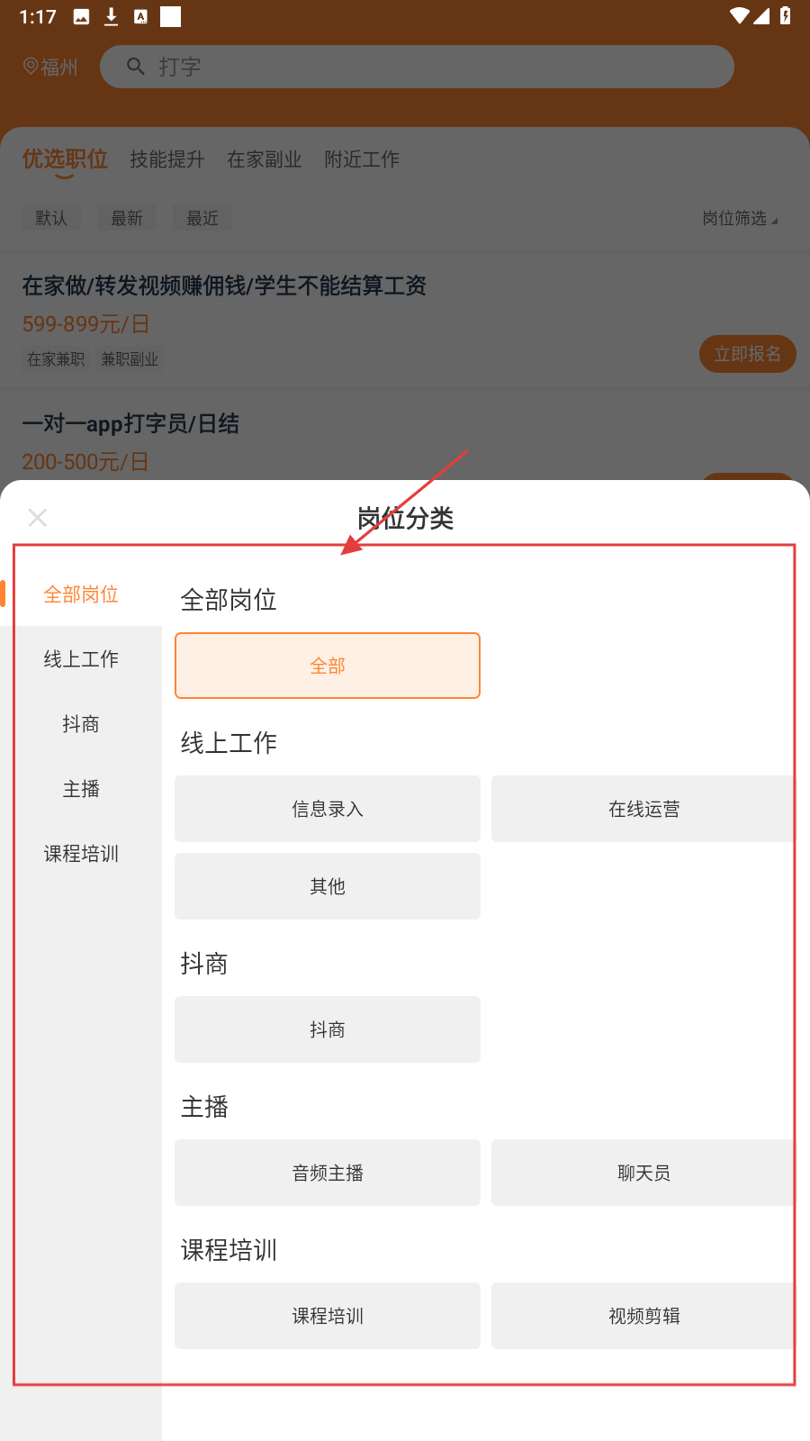 2、进入【岗位分类】,选感兴趣类别,如【线上工作-信息录入】,锁定目标岗。