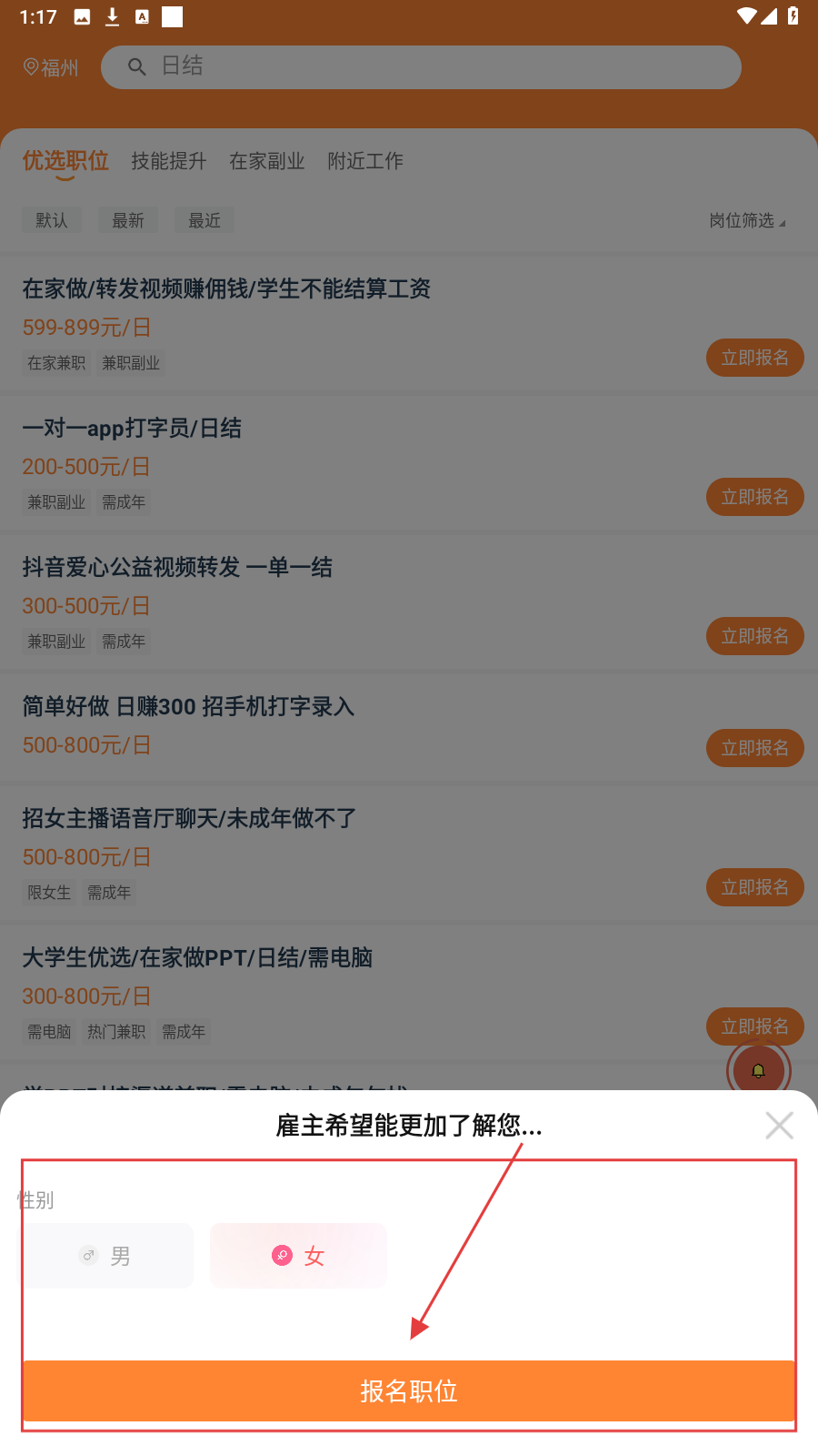 3、选好心仪岗位,填性别等信息,点【报名职位】,提交求职申请。