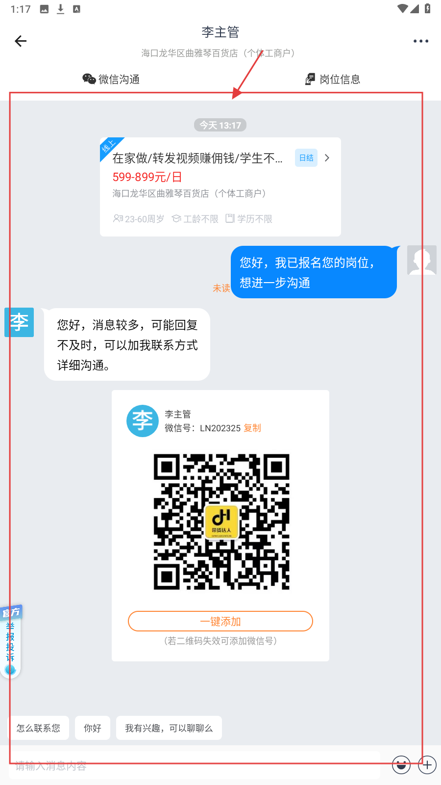 4、和【李主管】沟通,可发消息咨询,也可扫二维码【一键添加】微信详聊。