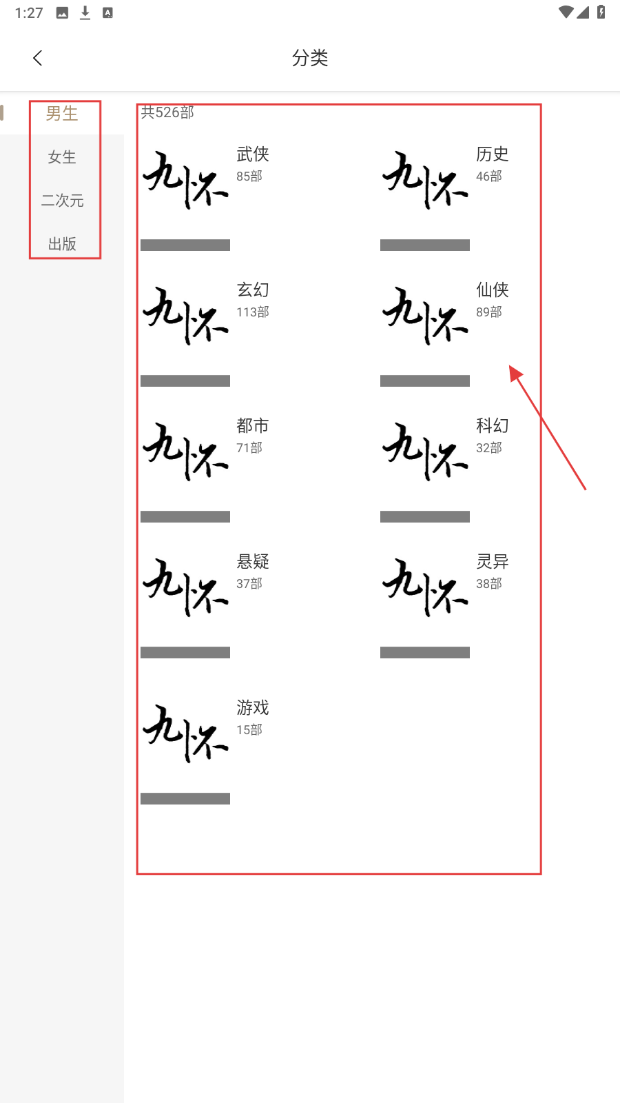 2、在【分类】界面,选【男生-仙侠】类别,浏览该分类下小说列表。
