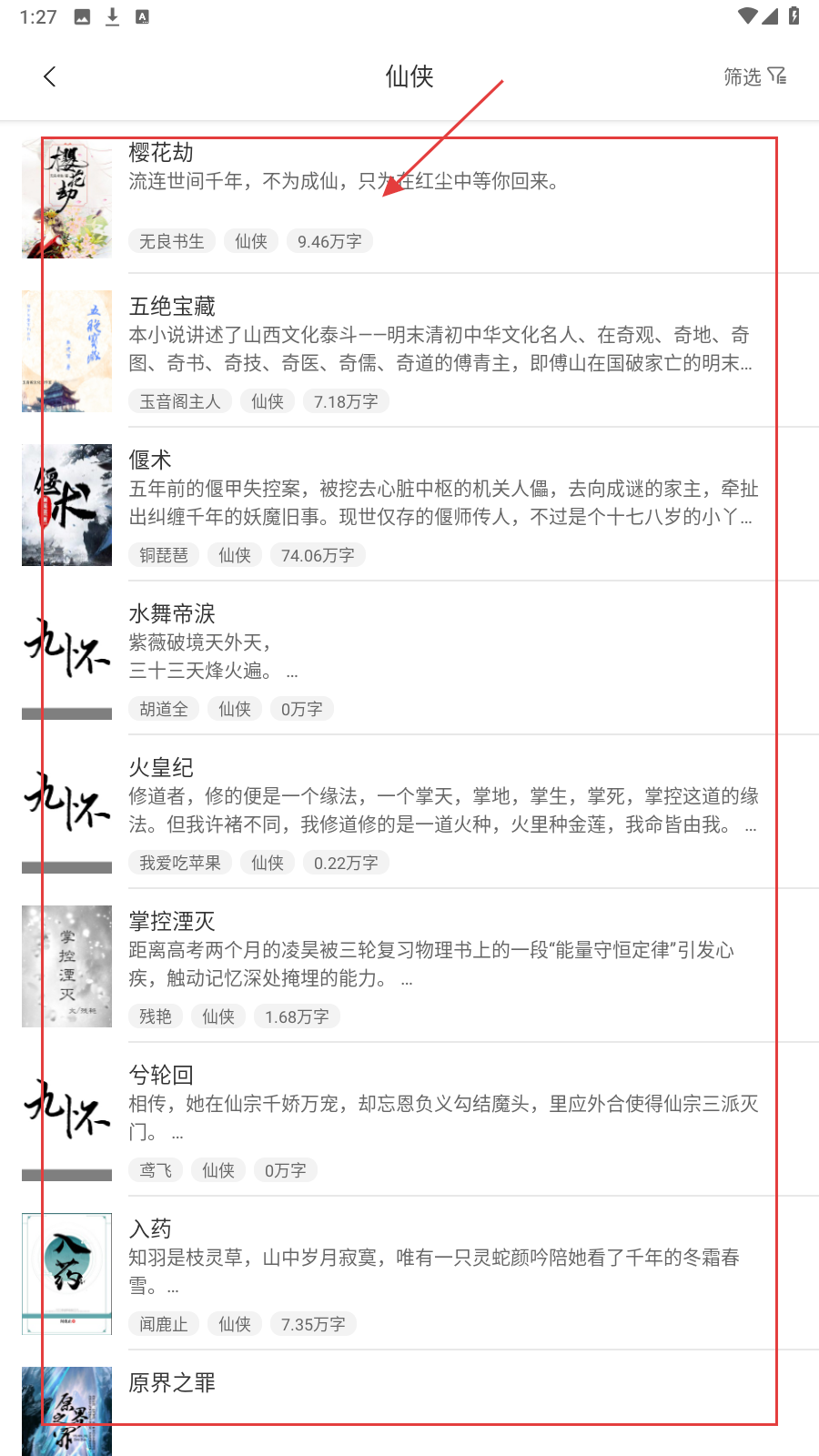 3、于【仙侠】分类里,挑选心仪小说如《樱花劫》,点击查看详情。