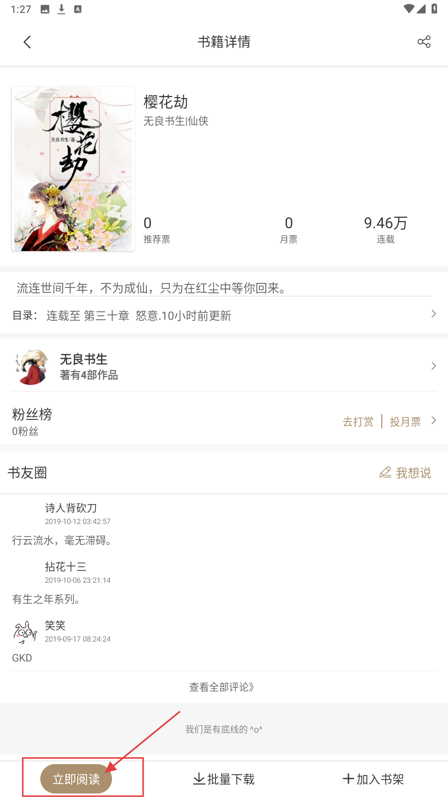 4、进入《樱花劫》详情页,点击【立即阅读】,开启小说阅读体验。