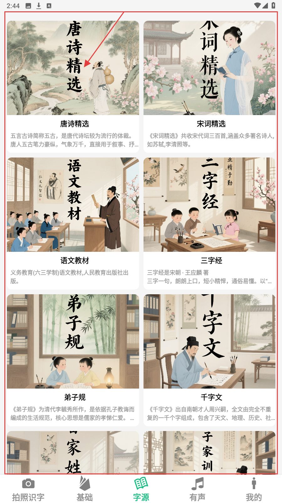 1、进入【字源】界面,选择【唐诗精选】卡片,开启唐诗学习之旅。