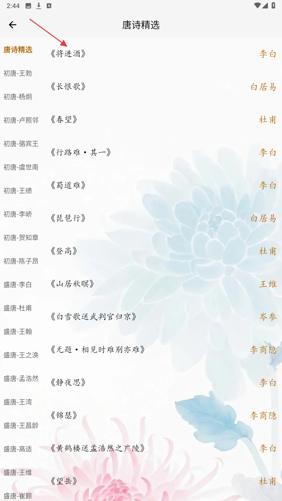 2、在【唐诗精选】列表,点击想学习的诗作,查看详情。