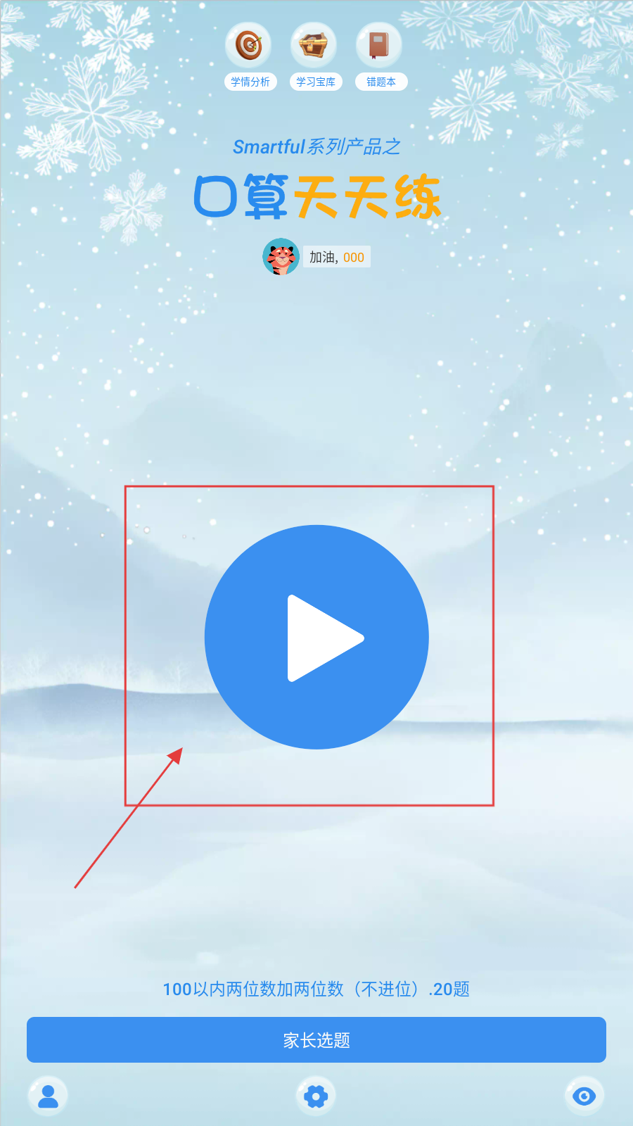 1、打开App,点蓝色播放按钮,开始【100以内两位数加两位数-不进位】口算练习。