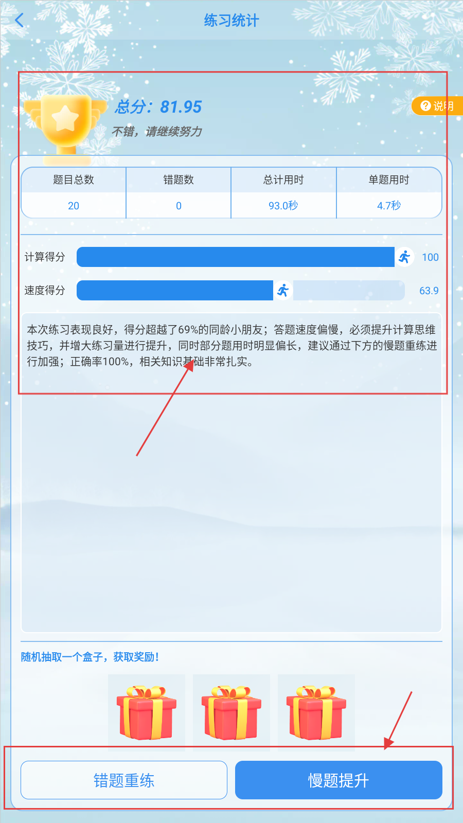 4、练习结束,看【练习统计】,依据得分、错题等,选【错题重练】或【慢题提升】巩固。