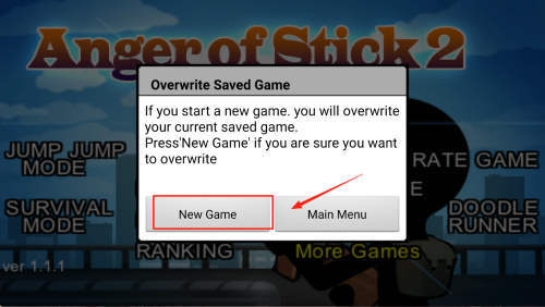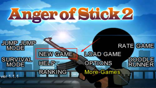 1、进入主菜单:在“AngerofStick2 JUMPJUMP MODE”界面点击“NEW GAME”开始新游戏。