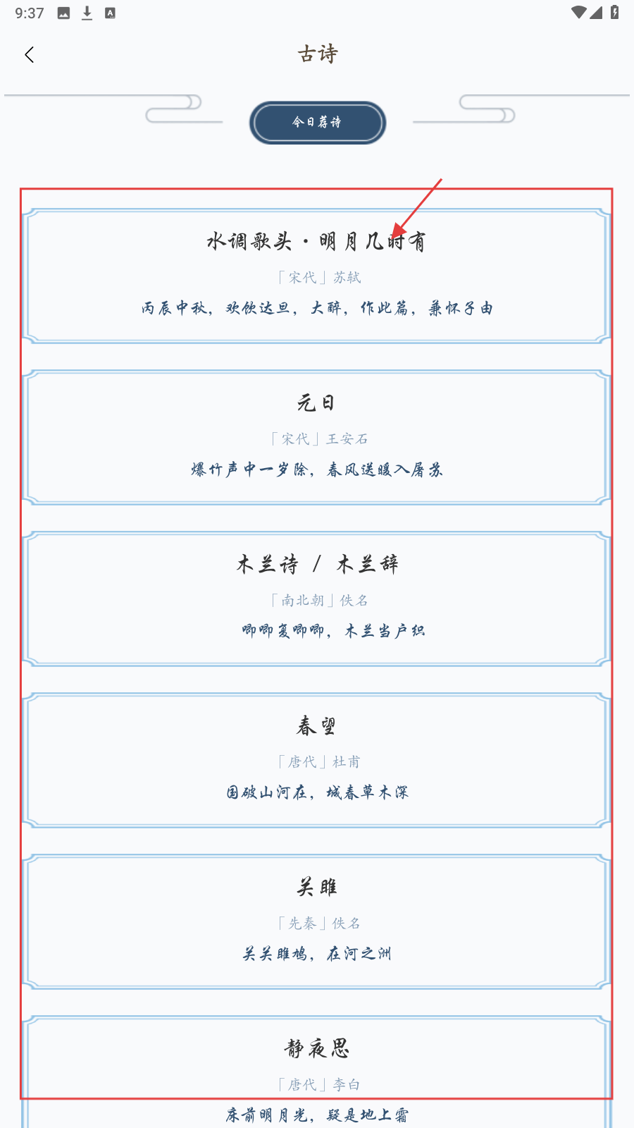 2、在【古诗】页面,选择要进行学习的古诗并点击。