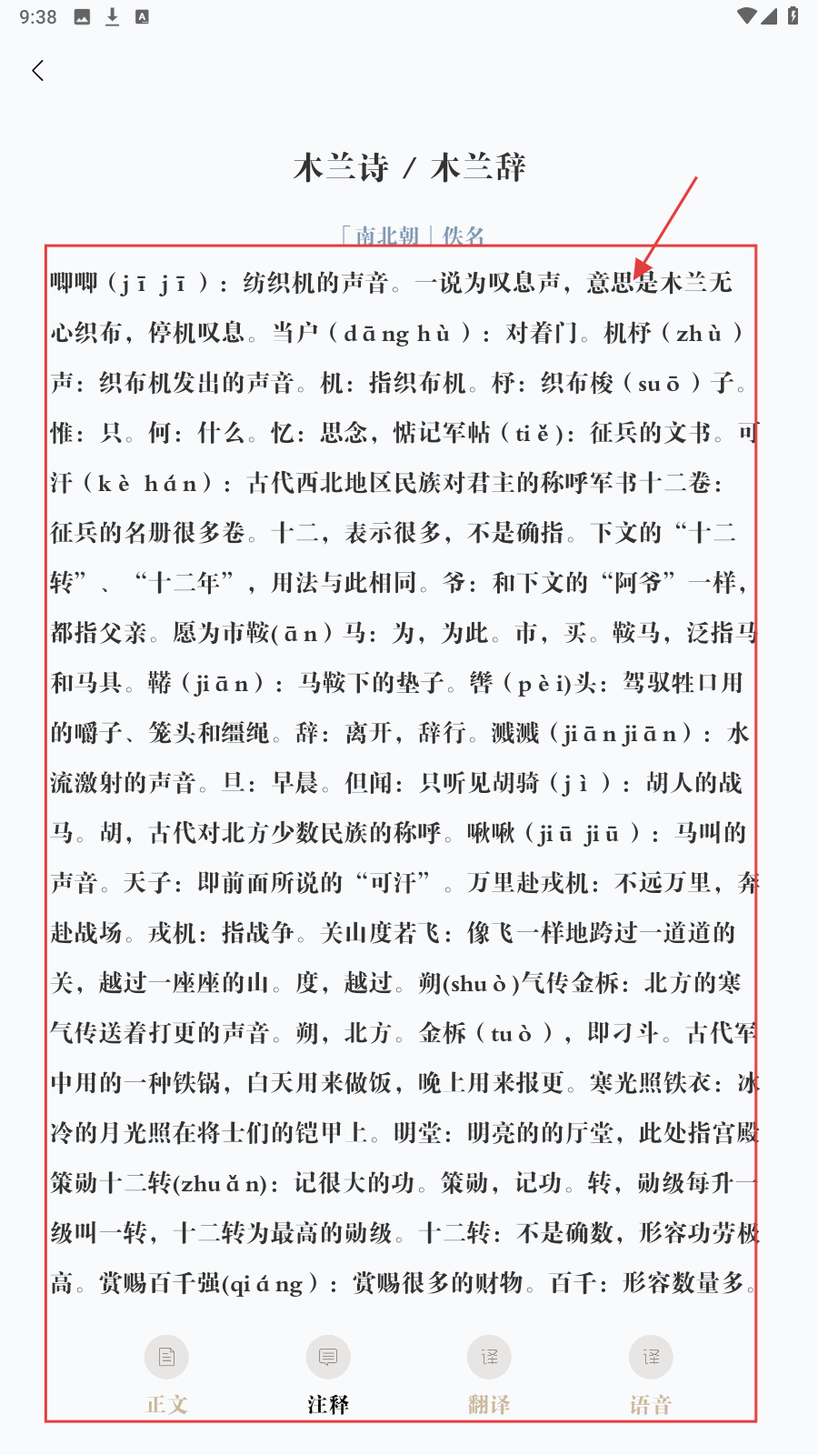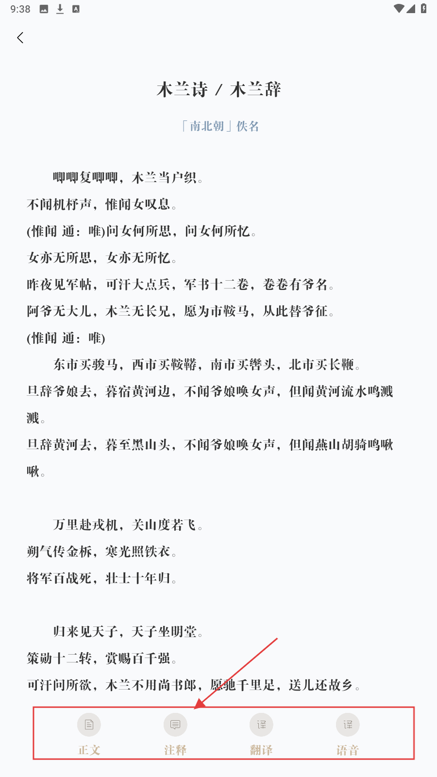 3、在古诗学习页面,查看古诗内容进行学习,也可以点击下方【注释】按钮。