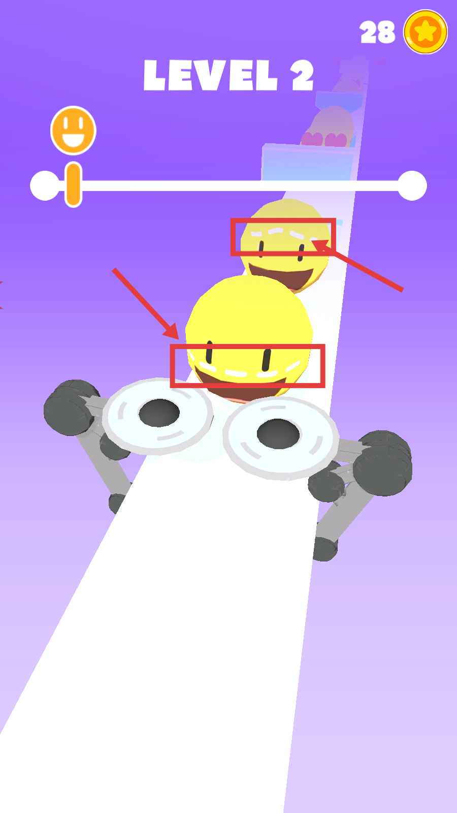 2、瞄准带白色虚线的【笑脸物体】发起切割,推进上方进度条,积累关卡完成度。