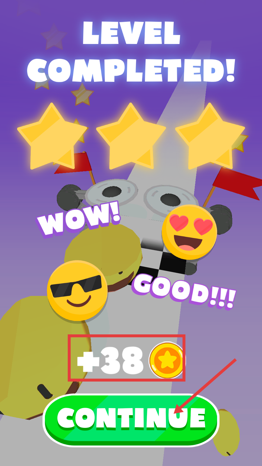 4、通关获得【+38-金币】奖励,点击绿色【CONTINUE】按钮,继续挑战下一关积累资源。