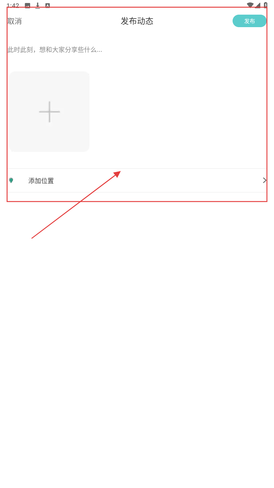 3、进入发布动态页,输入内容、添加图片/位置,分享生活。