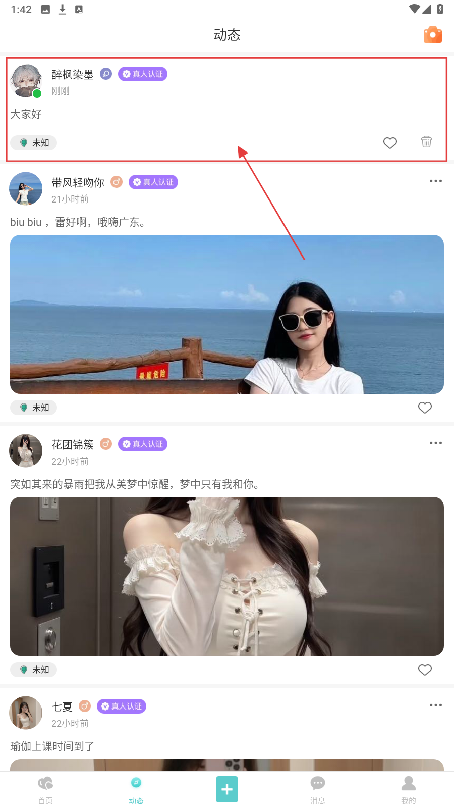 4、发布后,在【动态】页,可查看自己及他人动态,参与社交互动。