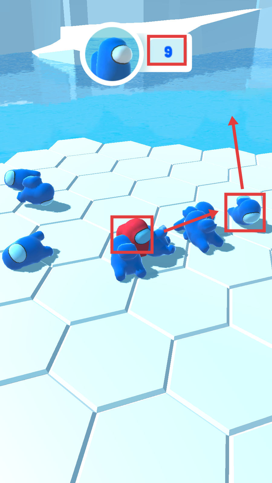 2、上方数字【9】显示剩余对手数,操控蓝色角色移动,靠近红色对手并发起攻击来减少对手数量。