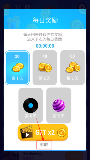 1、看到“每日奖励”页面时,点击“索取”领取第1天20奖励并激活连续签到。