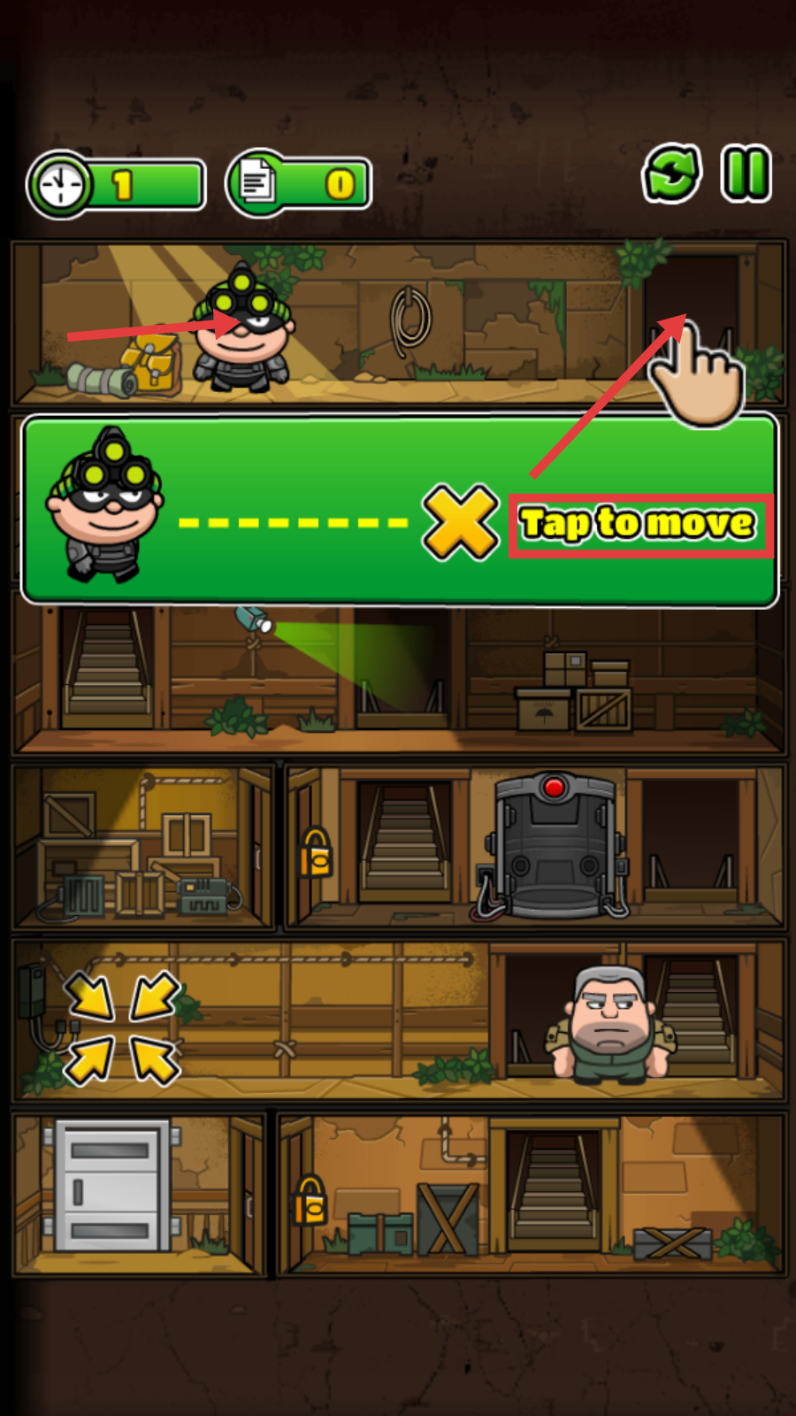 1、点击【Tap-to-move】提示区域,操控角色从最上层房间向右侧门口移动,开启潜入探索流程。