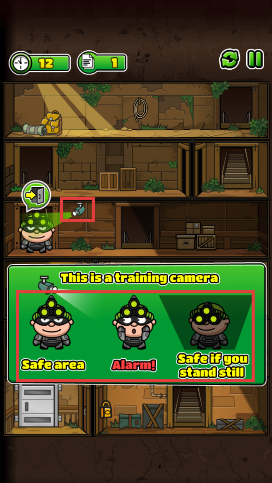 4、观察【training-camera】机制,在安全区自由行动,警报区需规避,静止时部分区域也安全,依状态行动。