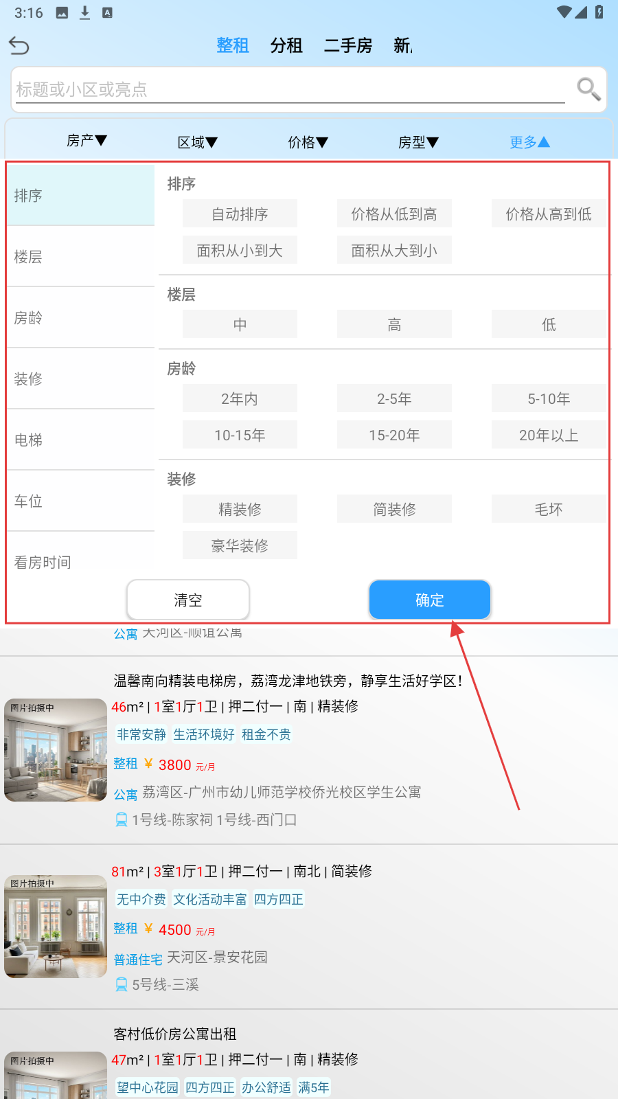3、选筛选条件后点【确定】,刷新符合要求的房源列表。