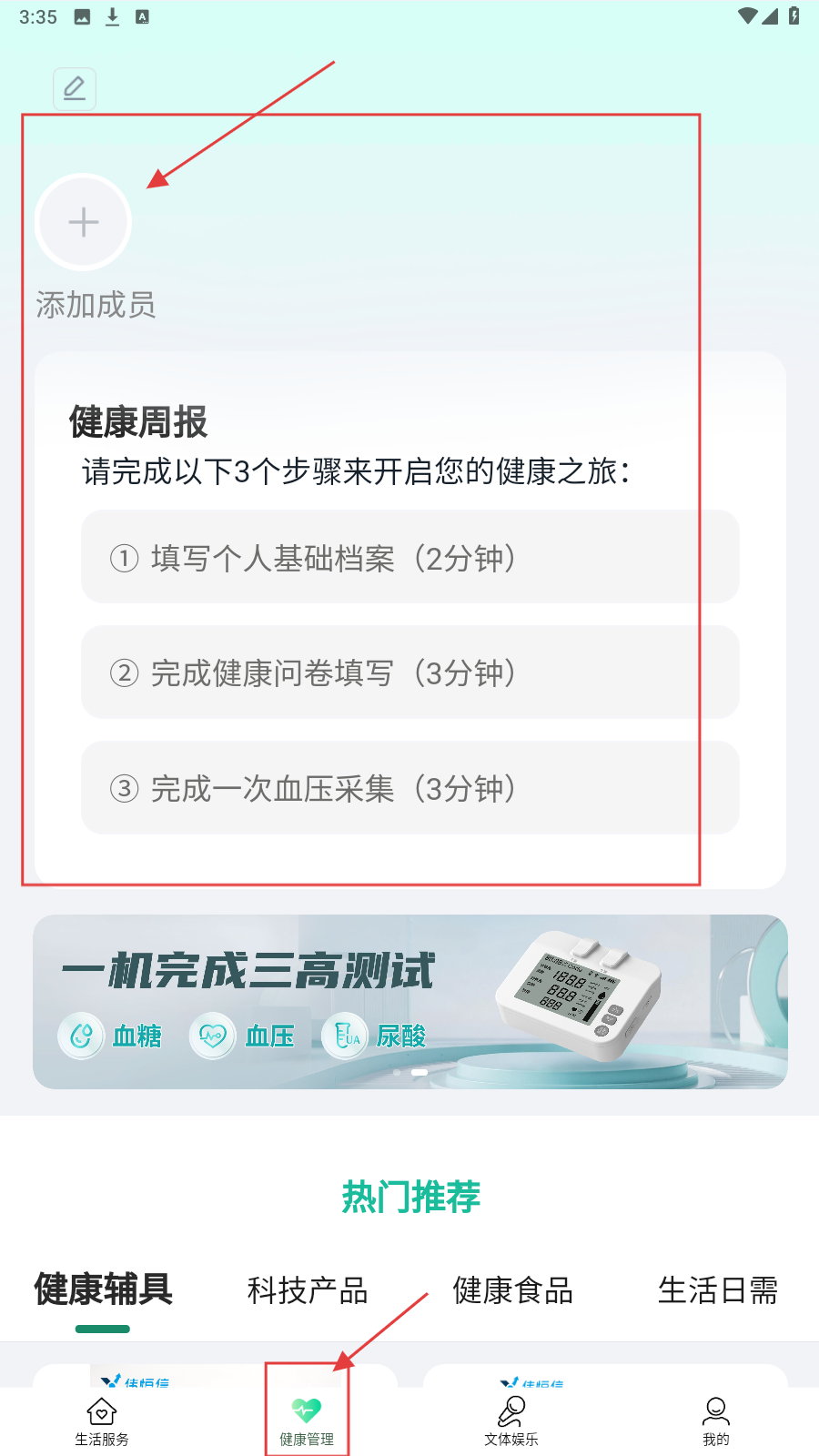 4、切换到【健康管理】页,点【+】添加成员,按指引完成健康周报。