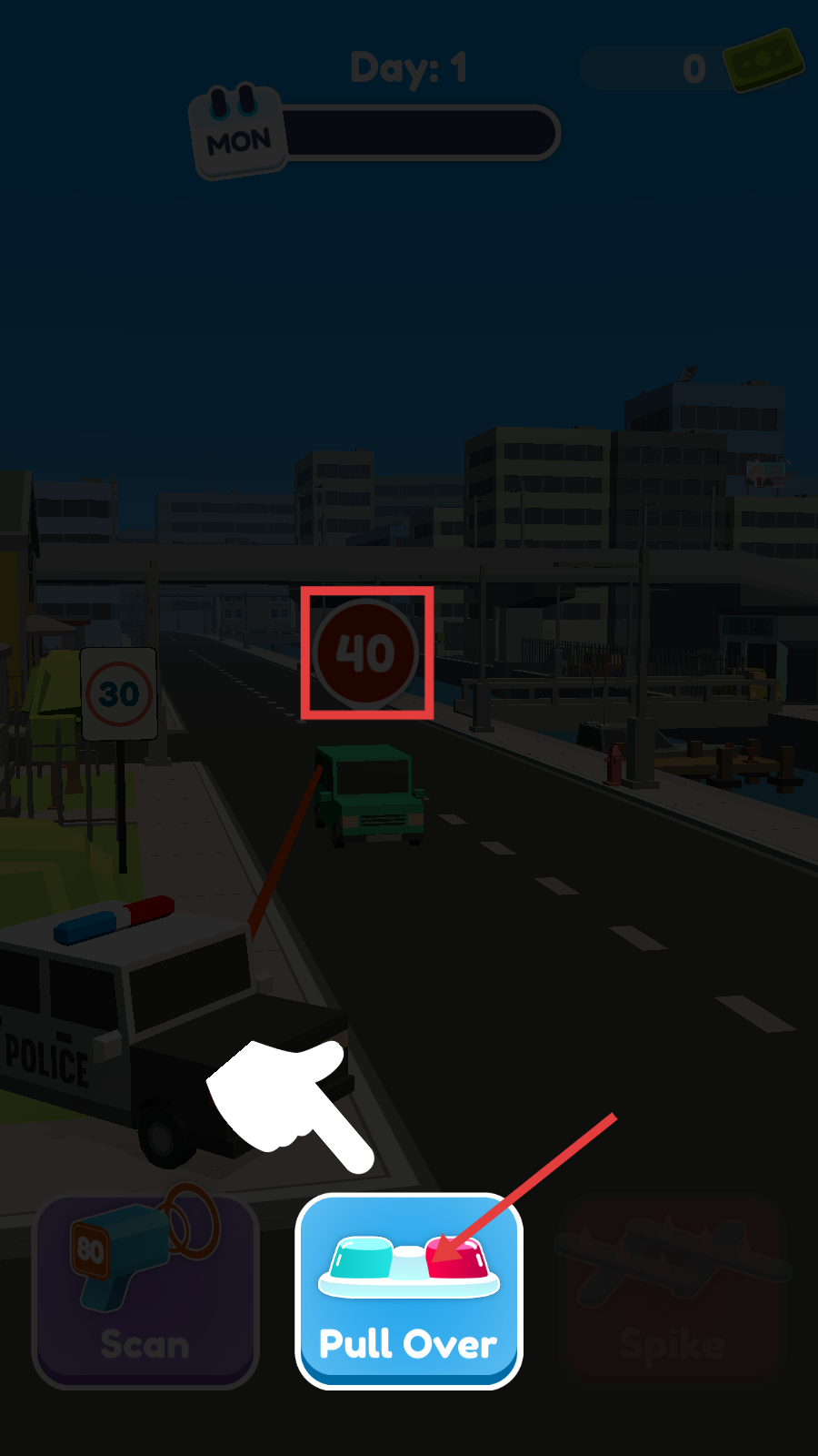 1、进入游戏点击【Tap-To-Start】,开启【Day-1】-【MON】的警察执法任务,准备开展道路巡逻工作。