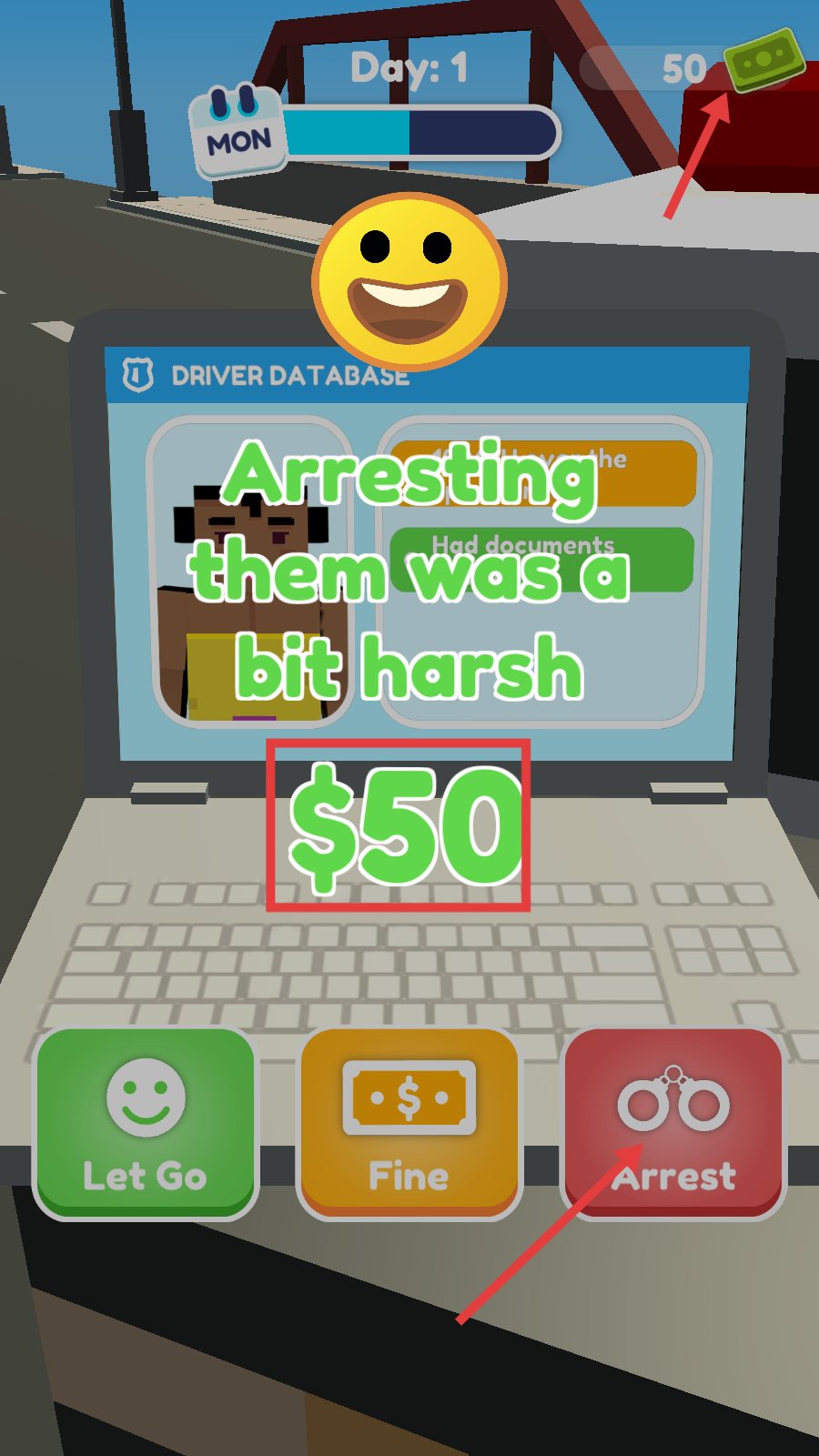 4、处理违规车辆时选择【Arrest】,在【Driver-Database】界面完成操作后可获得【$50】奖励,积累执法收益。